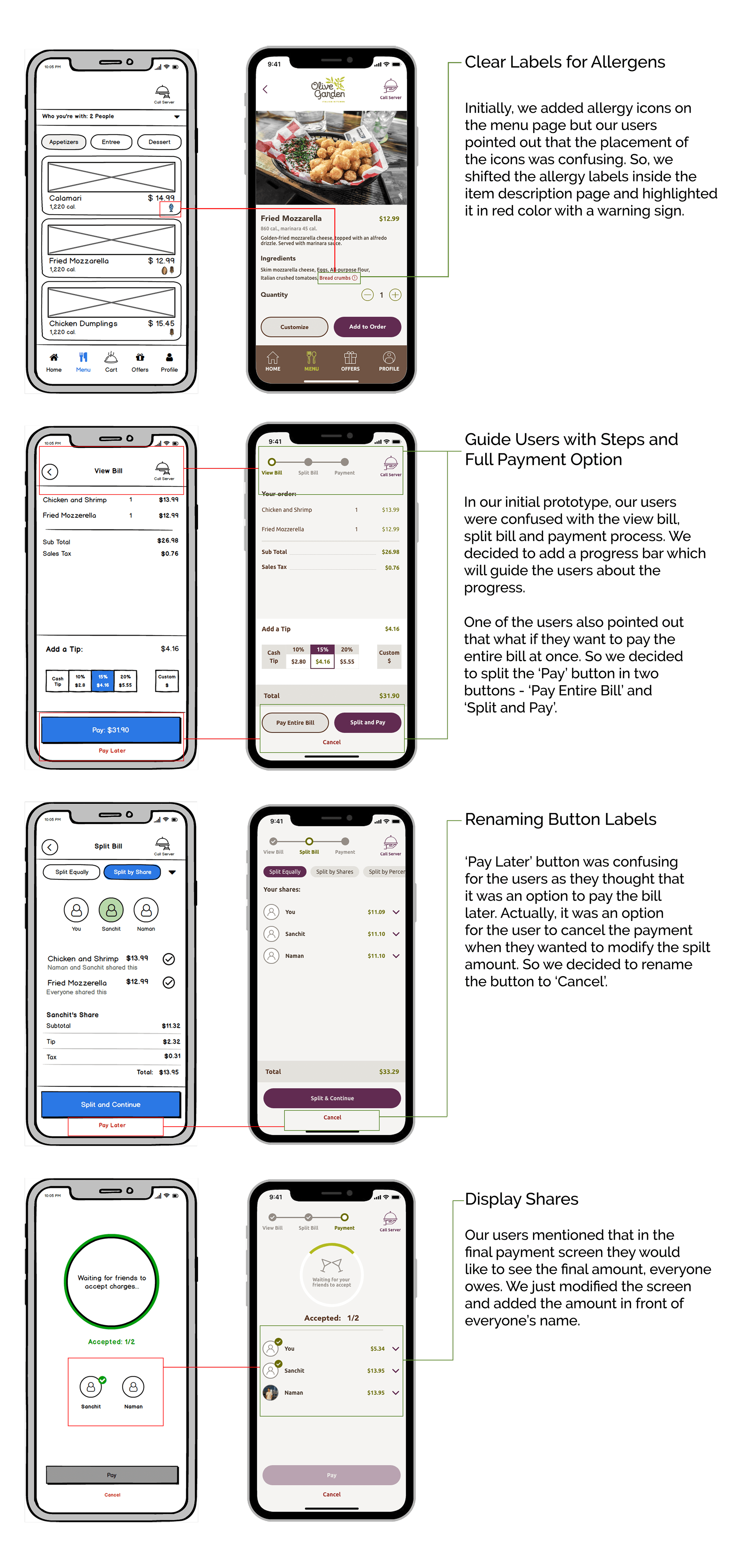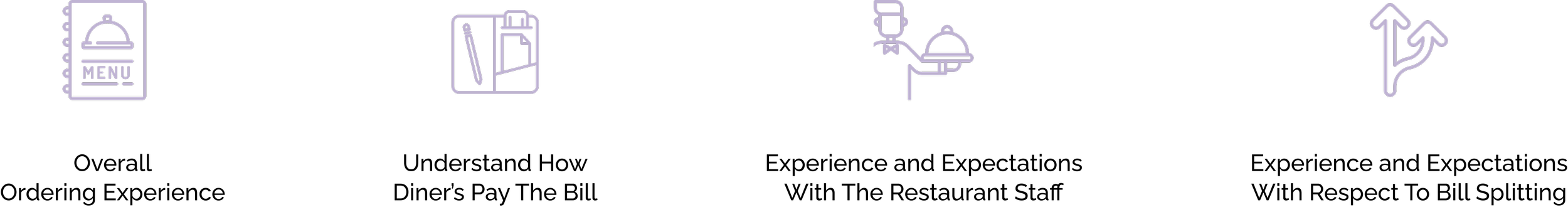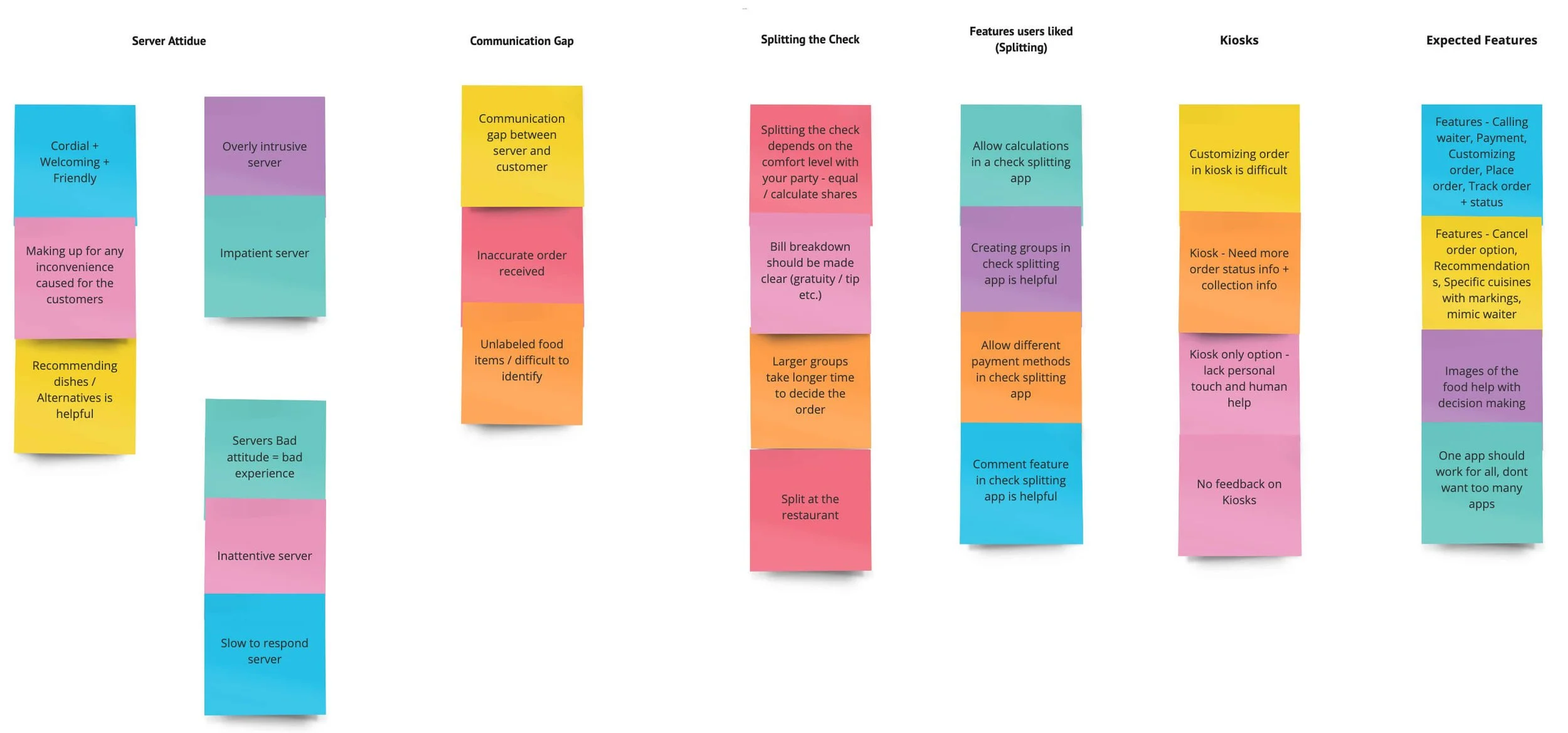 We mapped the entire dining journey to identify key pain points highlighted in red. Through our analysis, we identified four primary areas for further research: Ordering, Bill Payment, Bill Splitting, and Restaurant Staff.