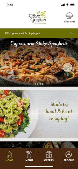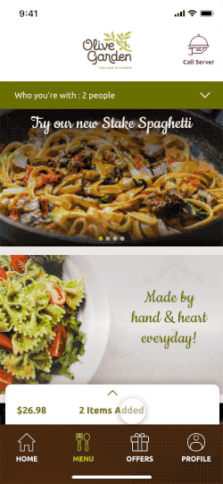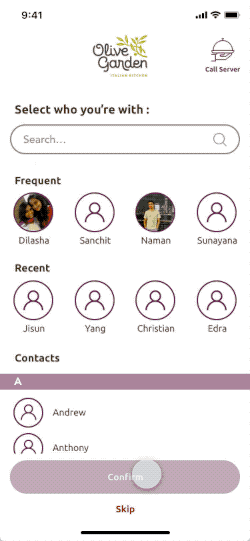 You’ve just installed Cordiallo on your mobile device and completed the onboarding process, including setting up your allergies, payment method, and other essential details. Now, you’re heading to Olive Garden for dinner with your friends Naman and Sanchit.
